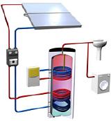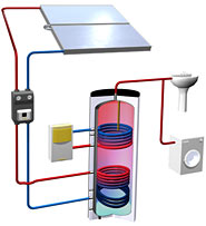 Durch die Wärme der Kollektorflüssigkeit (Glykolgemisch) wird über Wärmetauscher das Wasser im Solarspeicher aufgeheizt.